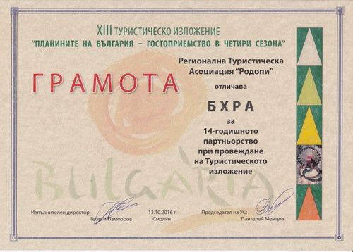 На официална вечеря под съпровода на родопски каба гайди Пантелей Мемцов – Председател на УС на РТА «Родопи» и Георги Пампоров – изп. директор на асоциацията връчиха грамота на Благой Рагин – Председател на БХРА за 14-годишното партньорство при провеждане на Туристическото изложение. С грамоти бяха отличени и представителите на общините Велико Търново, Варна, Чепеларе, Каспичан, Асеновград, Любимец и Самоков. Участниците в изложението посетиха и най-новата атракция в смолянският район – Горски парк Амзово.