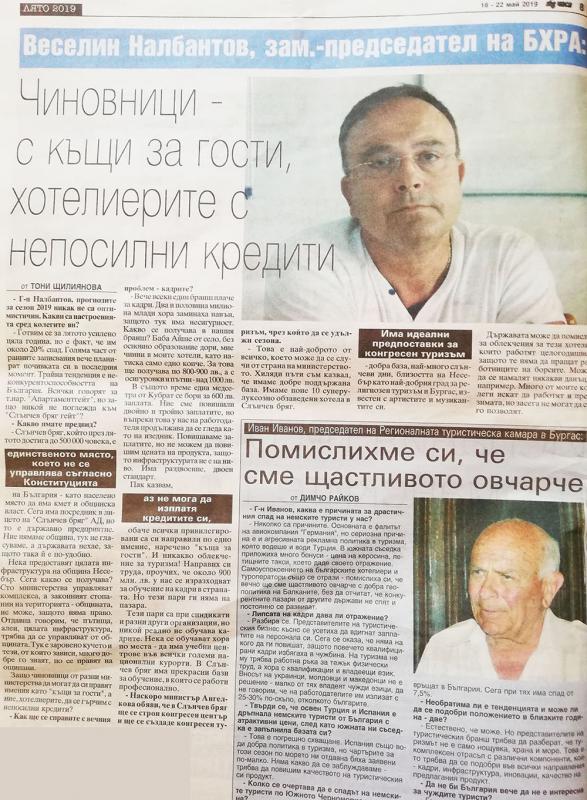 Инервю на Веселин Налбантов, зам.-председател на БХРА пред вестник 168 часа, бр. 16-22 май 2019