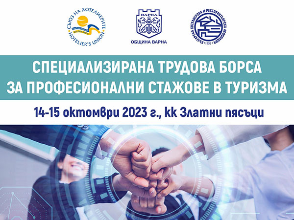 В периода 14-15 октомври 2023 г. в кк Златни пясъци се проведе СПЕЦИАЛИЗИРАНА ТРУДОВА БОРСА ЗА ПРОФЕСИОНАЛНИ СТАЖОВЕ В ТУРИЗМА, организирана от Съюза н хотелиерите – Златни пясъци, БХРА и с подкрепата на Община Варна.